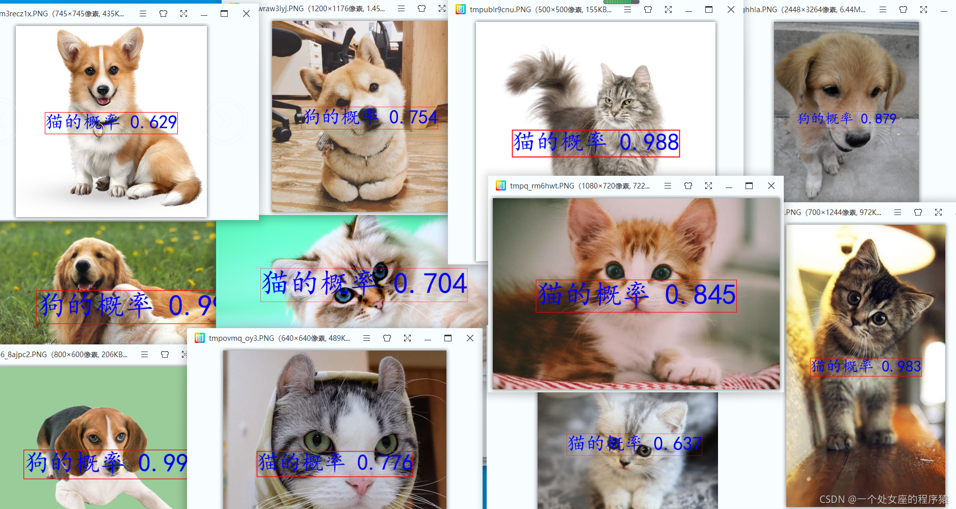 | 17 | dog (10).jpg 狗的概率 0.628 | dog (10).jpg 猫的概率 0.629 | dog (10).jpg 猫的概率 0.994 | dog (10).jpg 猫的概率 1.000 | dog (10).jpg 猫的概率 1.000 | |
