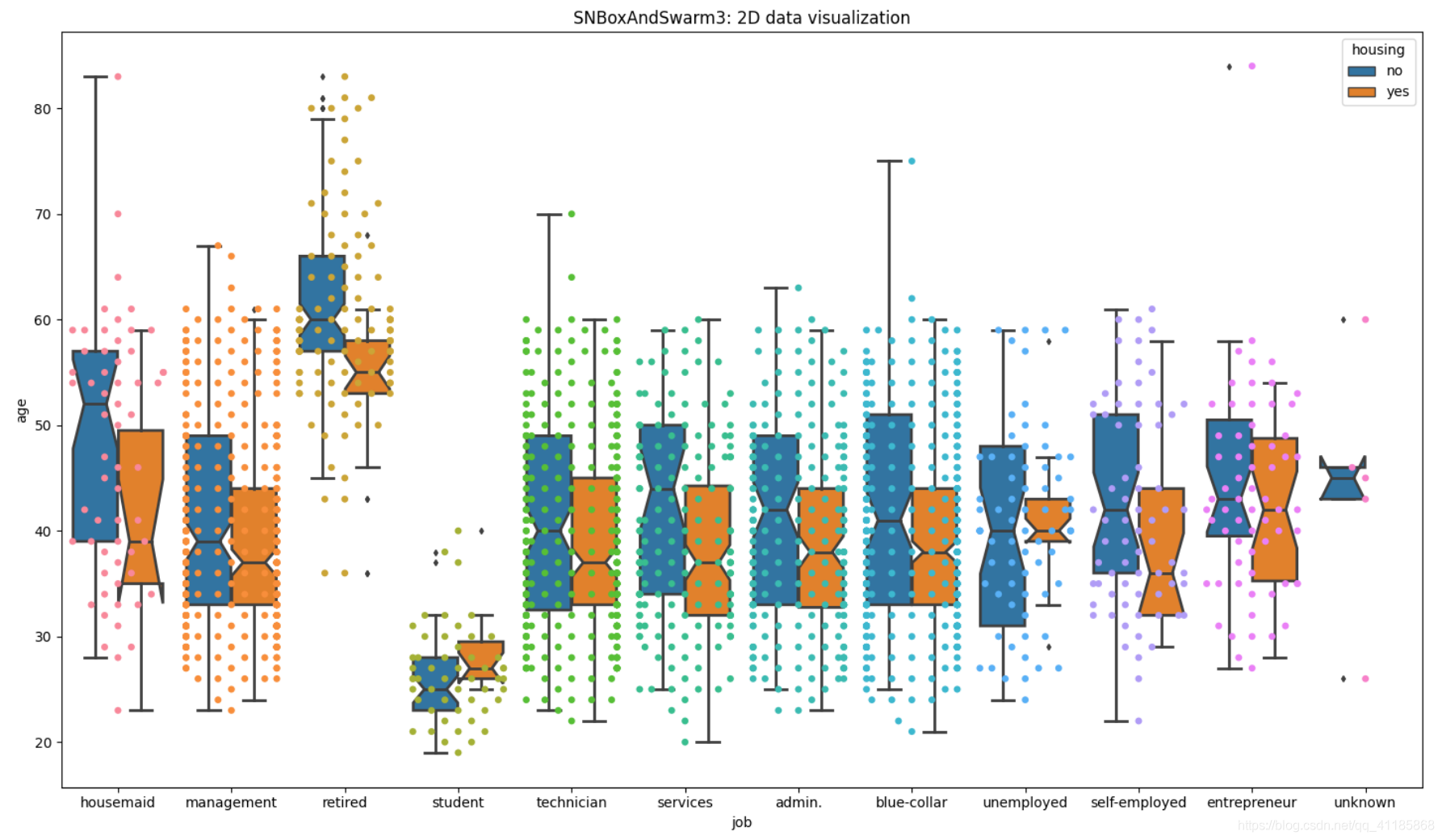 1. sns.boxplot(x=cols[0],y=cols[1],data=data_frame, 2. hue=cols[2], # 该特征必须为类别型特征 3. linewidth=2, width=0.8, fliersize=3, # 线宽、箱之间的间隔比例,异常点大小 4. whis = 1.5, # 设置IQR 5. notch = True, # 设置是否以中值做凹槽,尝试测试----------------- 6. # order = ['Thur','Fri','Sat','Sun'], 7. ) 8. sns.swarmplot(x=cols[0],y=cols[1],data=data_frame, 9. # color ='k',size = 3,alpha = 0.8, 10. )
