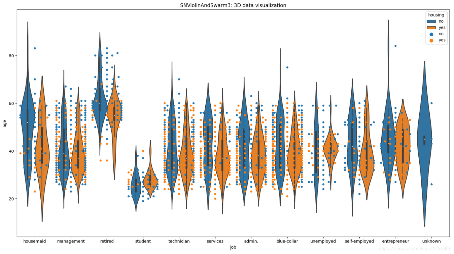 1. sns.violinplot(x=cols[0],y=cols[1],data=data_frame, 2. hue=cols[2], # 该特征必须为类别型特征 3. scale = 'area', # 测度小提琴图的宽度:area-面积相同,count-按照样本数量决定宽度,width-宽度一样 4. gridsize = 50, # 设置小提琴图边线的平滑度,越高越平滑 5. inner = 'box', # 设置内部显示类型 → box、quartile、point、stick、None,尝试测试----------------- 6. # split=True, # 设置是否拆分小提琴图,前提条件是第三特征为二类别属性,尝试测试----------------- 7. #bw = 0.8 # 控制拟合程度,一般可以不设置 8. ) 9. sns.swarmplot(x=cols[0],y=cols[1],data=data_frame, 10. hue=cols[2], # 该特征必须为类别型特征 11. # color="w", alpha=.5, 12. )