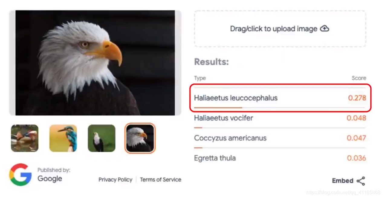TensorFlow Hub 为您提供超过 10000 个预先训练好的模型存储库,可以重复使用和构建这些模型,可以在浏览器中测试这些模型。比如,这里有个训练好的识别鸟的模型,此时可以直接在浏览器中拖动图片来测试模型,然后会显示出这是一种什么鸟。