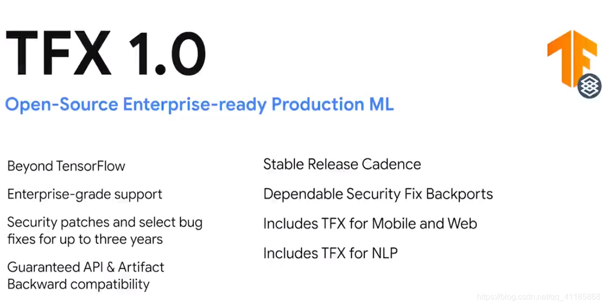 TFX1.0 超越了 TesnsorFlow,包含您可能用于训练模型的其他框架。它包含生产框架所需要的一切,如企业级支持、安全补丁、错误修复等,以及有保证性的向后兼容性。它还有一个稳定的发布节奏,以及对在 Google Cloud 上良好运行的强大支持,还有对移动端、Web 端和NLP 应用的支持。