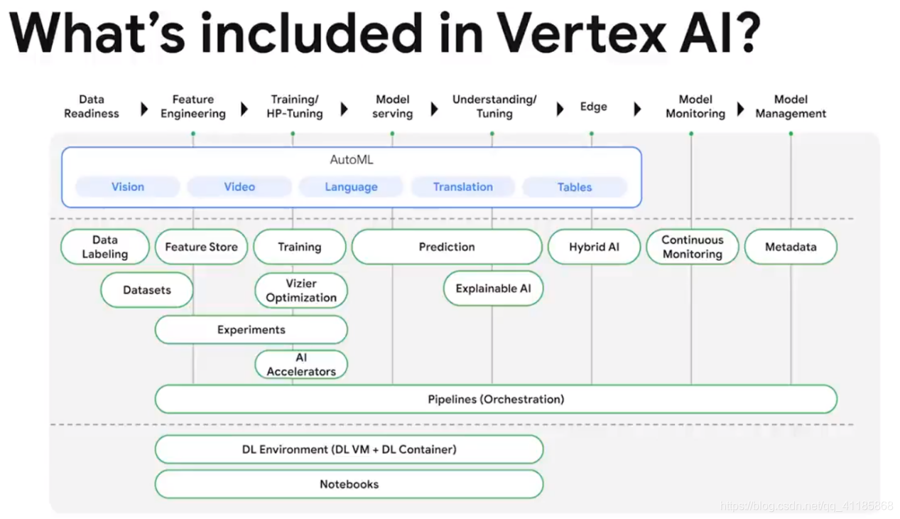 Vertex AI 是一个管理式机器学习平台,可帮助加快AI模型的实验和部署,使工作流的每个阶段都变得更加容易,Vertex AI 拥有高效地部署 AI 所需的一切,包括Notebook, 数据标注,特征管理,内置Tensorboard,托管式训练服务,模型的预测、连续监控等。