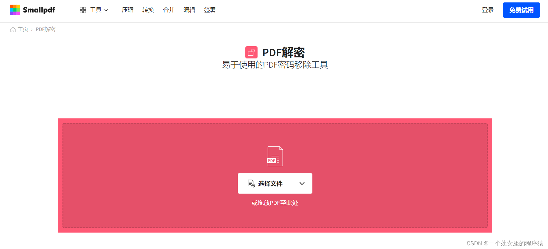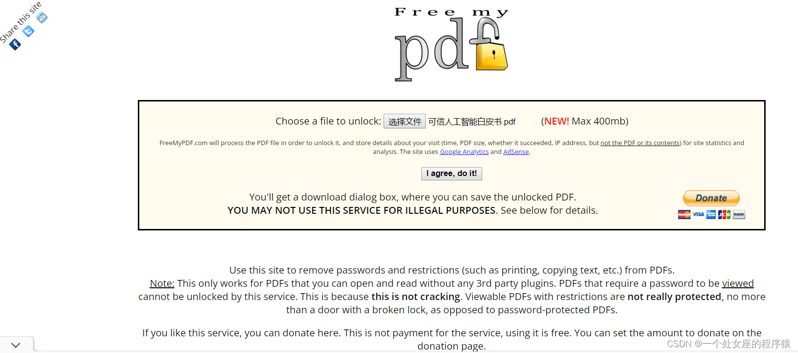 这是一个可以免费在线解除 PDF 文档的密码和限制的网站,操作也非常简单,单击“选择文件”上传需要解密的 PDF 文件就可以了,一般很快就可以解密完成,并自动下载。虽然规定了上传的 PDF 文档不能超过 400M,但一般很少会有这么大的 PDF 吧。