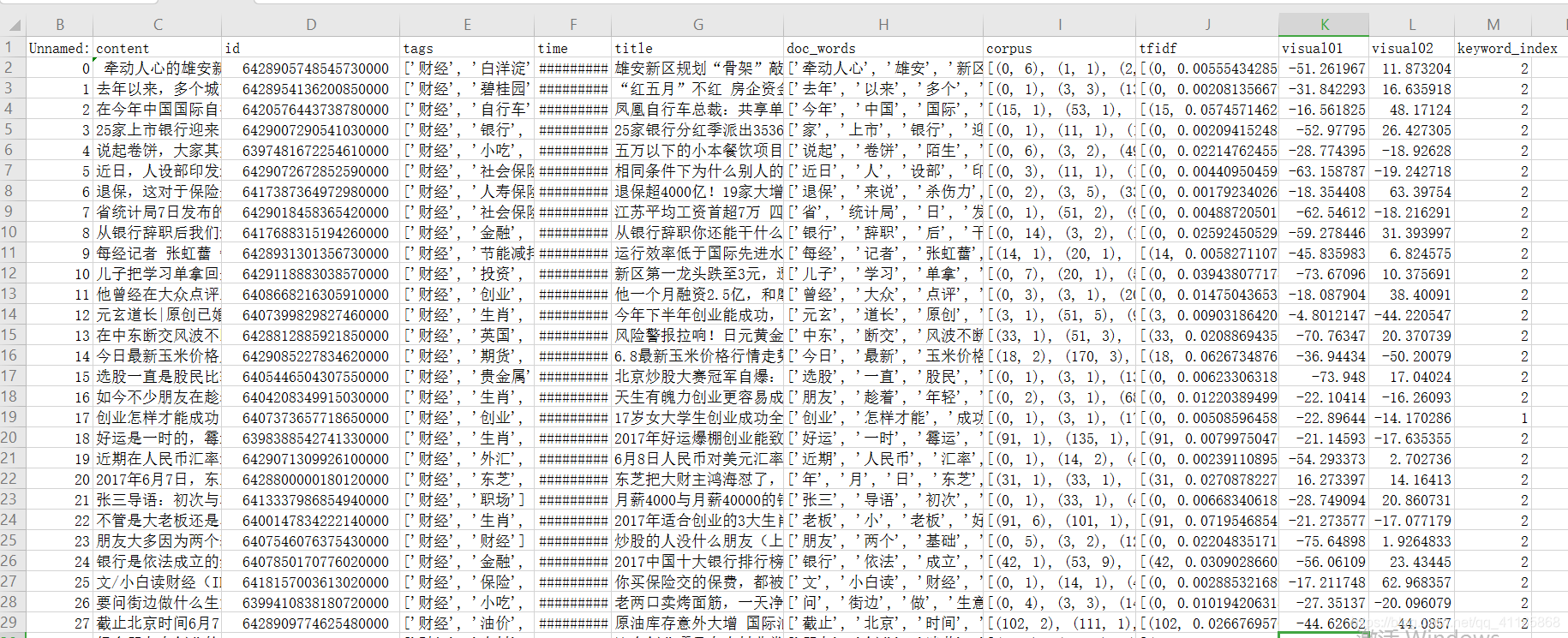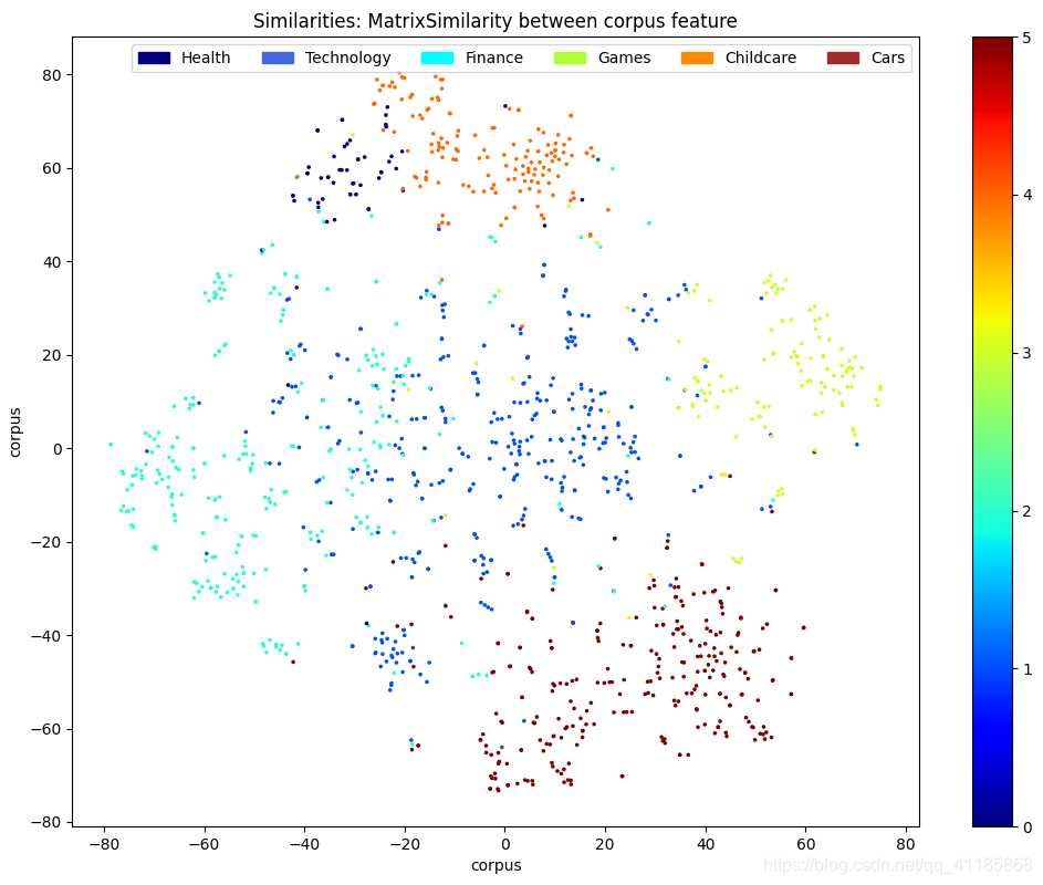 1. F:\Program Files\Python\Python36\lib\site-packages\gensim\utils.py:1209: UserWarning: detected Windows; aliasing chunkize to chunkize_serial 2. warnings.warn("detected Windows; aliasing chunkize to chunkize_serial") 3. <class 'pandas.core.frame.DataFrame'> 4. RangeIndex: 1293 entries, 0 to 1292 5. Data columns (total 6 columns): 6. # Column Non-Null Count Dtype 7. --- ------ -------------- ----- 8. 0 Unnamed: 0 1293 non-null int64 9. 1 content 1292 non-null object 10. 2 id 1293 non-null int64 11. 3 tags 1293 non-null object 12. 4 time 1293 non-null object 13. 5 title 1293 non-null object 14. dtypes: int64(2), object(4) 15. memory usage: 60.7+ KB 16. None 17. 18. id tags \ 19. 0 6428905748545732865 ['财经', '白洋淀', '城市规划', '徐匡迪', '太行山'] 20. 1 6428954136200855810 ['财经', '碧桂园', '万科集团', '投资', '广州恒大'] 21. 2 6420576443738784002 ['财经', '自行车', '凤凰', '王朝阳', '汽车展览'] 22. 3 6429007290541031681 ['财经', '银行', '工商银行', '兴业银行', '交通银行'] 23. 4 6397481672254619905 ['财经', '小吃', '装修', '市场营销', '手工艺'] 24. 25. time title 26. 0 2017-06-07 22:52:55 雄安新区规划“骨架”敲定,方案有望9月底出炉 27. 1 2017-06-08 08:01:13 “红五月”不红 房企资金链压力攀升 28. 2 2017-05-16 12:03:00 凤凰自行车总裁:共享单车把我们打懵了 29. 3 2017-06-08 07:00:00 25家银行分红季派出3536亿“大红包” 30. 4 2017-03-15 07:03:22 五万以下的小本餐饮项目,卷饼赚钱最稳 31. chinese_pattern re.compile('[\\u4e00-\\u9fff]+') 32. Building prefix dict from F:\File_Jupyter\实用代码\naive_bayes(简单贝叶斯)\jieba_dict\dict.txt.big ... 33. Loading model from cache C:\Users\niu\AppData\Local\Temp\jieba.ue3752d4e13420d2dc6b66831a5a4ab13.cache 34. Loading model cost 1.326 seconds. 35. Prefix dict has been built succesfully. 36. dictionary 37. <class 'gensim.corpora.dictionary.Dictionary'> Dictionary(46351 unique tokens: ['一个', '一个个', '一举一动', '一些', '一体']...) 38. <class 'method'> <bound method Dictionary.doc2bow of <gensim.corpora.dictionary.Dictionary object at 0x000001BDC62291D0>> 39. F:\Program Files\Python\Python36\lib\site-packages\numpy\core\_asarray.py:83: VisibleDeprecationWarning: Creating an ndarray from ragged nested sequences (which is a list-or-tuple of lists-or-tuples-or ndarrays with different lengths or shapes) is deprecated. If you meant to do this, you must specify 'dtype=object' when creating the ndarray 40. return array(a, dtype, copy=False, order=order) 41. 42. 43. corpus \ 44. 0 [(0, 6), (1, 1), (2, 1), (3, 3), (4, 2), (5, 2... 45. 1 [(0, 1), (3, 3), (13, 1), (17, 1), (41, 1), (5... 46. 2 [(15, 1), (53, 1), (167, 1), (262, 1), (396, 1... 47. 48. tfidf 49. 0 [(0, 0.005554342859788116), (1, 0.007470250835... 50. 1 [(0, 0.002081356679198299), (3, 0.012288034179... 51. 2 [(15, 0.057457146244872616), (53, 0.0543395377... 52. after abs 4.7683716e-07 53. foo: (1293, 1293) 54. dis2TSNE_Visual: (1293, 2) 55. {'养生': 0, '科技': 1, '财经': 2, '游戏': 3, '育儿': 4, '汽车': 5} 56. data_frame.keyword_index: 1 379 57. 2 287 58. 5 283 59. 4 148 60. 3 141 61. 0 55 62. Name: keyword_index, dtype: int64 63. 64. id tags \ 65. 0 6428905748545732865 ['财经', '白洋淀', '城市规划', '徐匡迪', '太行山'] 66. 1 6428954136200855810 ['财经', '碧桂园', '万科集团', '投资', '广州恒大'] 67. 2 6420576443738784002 ['财经', '自行车', '凤凰', '王朝阳', '汽车展览'] 68. 69. 70. doc_words \ 71. 0 [牵动人心, 雄安, 新区, 规划, 细节, 内容, 出台, 时间表, 敲定, 日前, 北京... 72. 1 [去年, 以来, 多个, 城市, 先后, 发布, 多项, 楼市, 调控, 政策, 限购, 限... 73. 2 [今年, 中国, 国际, 自行车, 展上, 上海, 凤凰, 自行车, 总裁, 王, 朝阳, ... 74. 75. corpus \ 76. 0 [(0, 6), (1, 1), (2, 1), (3, 3), (4, 2), (5, 2... 77. 1 [(0, 1), (3, 3), (13, 1), (17, 1), (41, 1), (5... 78. 2 [(15, 1), (53, 1), (167, 1), (262, 1), (396, 1... 79. 80. tfidf visual01 visual02 \ 81. 0 [(0, 0.005554342859788116), (1, 0.007470250835... -65.903542 -14.433964 82. 1 [(0, 0.002081356679198299), (3, 0.012288034179... -29.659267 -14.811647 83. 2 [(15, 0.057457146244872616), (53, 0.0543395377... -22.118195 -48.148167 84. 85. keyword_index 86. 0 2 87. 1 2 88. 2 2 89. Childcare,label_category_ID_pos.tfidf)[:20]: ['孩子', '家长', '教育', '学习', '男孩子', '成绩', '爸爸', '分享', '帮助', '方法', '小学', '数学', '交流', '男孩', '妈妈', '成长', '父母', '懂', '免费', '翼航'] 90. Childcare,label_category_ID_neg.tfidf)[:20]: [] 91. train_index MatrixSimilarity<646 docs, 46329 features> 92. hot_words shape: 6 300 93. {0: {1536, 7681, 17410, 17411, 17415, 6664, 17420, 15886, 4623, 17935, 4625, 5139, 4631, 17916, 17437, 544, 16422, 5671, 1065, 4650, 4651, 4653, 4690, 16943, 4657, 17458, 15921, 51, 7222, 17464, 17465, 10299, 15932, 64, 6209, 66, 17474, 4680, 8264, 8266, 40008, 6730, 8273, 6738, 5203, 5206, 18005, 15958, 597, 15960, 18009, 7258, 4697, 7260, 16989, 3674, 91, 87, 16993, 18020, 616, 4714, 5228, 40044, 1646, 4720, 3185, 15986, 34928, 5236, 113, 34936, 6777, 126, 15999, 127, 4737, 40067, 5252, 643, 4739, 13444, 8840, 1157, 133, 4749, 3219, 10388, 17562, 5278, 46239, 5287, 3751, 167, 680, 6827, 4784, 16048, 16050, 180, 46260, 16054, 6839, 4792, 2743, 4789, 17083, 16060, 4790, 16062, 43200, 5315, 46276, 46279, 17098, 6860, 5836, 16081, 43219, 1237, 1750, 15575, 8921, 2266, 6877, 12511, 12512, 21216, 226, 4834, 6884, 16101, 4838, 742, 2280, 2281, 227, 7915, 6886, 6893, 2798, 6894, 5870, 4849, 242, 1779, 4852, 21215, 44791, 4864, 3329, 258, 4865, 4866, 44805, 4877, 21264, 4882, 274, 8986, 8987, 796, 32029, 4382, 21277, 4896, 1825, 801, 3363, 36644, 1830, 4393, 36138, 303, 815, 4401, 12594, 21299, 7986, 820, 310, 1337, 21307, 4411, 317, 33598, 5953, 17730, 5954, 10050, 17733, 17734, 25927, 21320, 17739, 4939, 21324, 