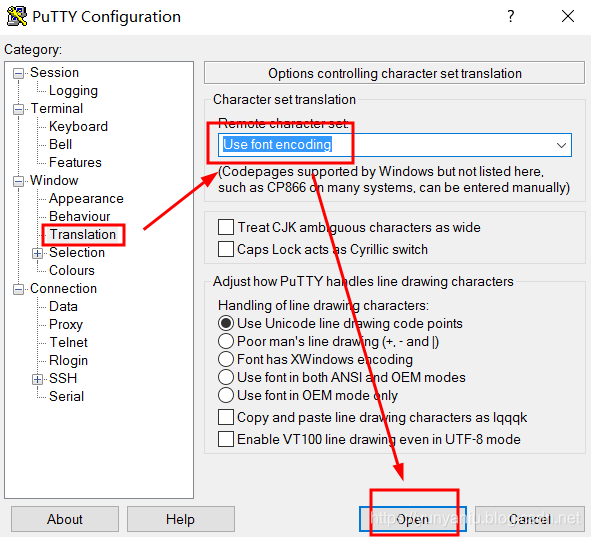 2、然后切换至“Window”下的“Translation”选项,打开"Remote character set"的选择框,在下拉菜单中选中"Use font encoding",之后在按照常规方式建立连接即可。