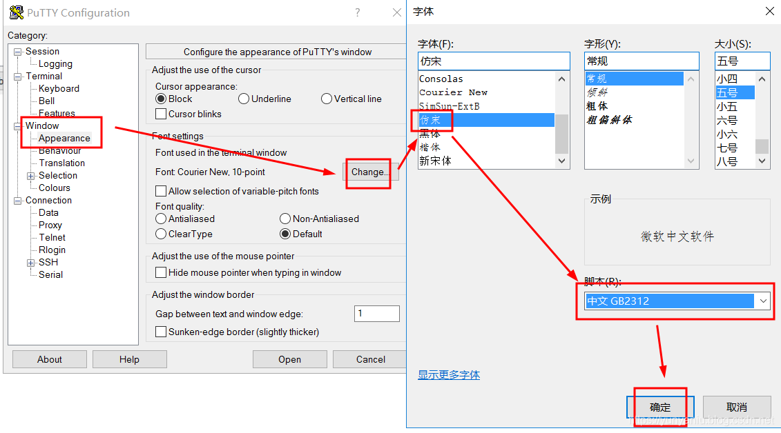 1、打开Putty,点击“Window”下的“Appearance”选项,点击“Font settings”后的“Change”按钮。这样会打开字体设置窗口,选择一款中文字体,然后在下方“脚本”栏中选择“中文_GB2312”。