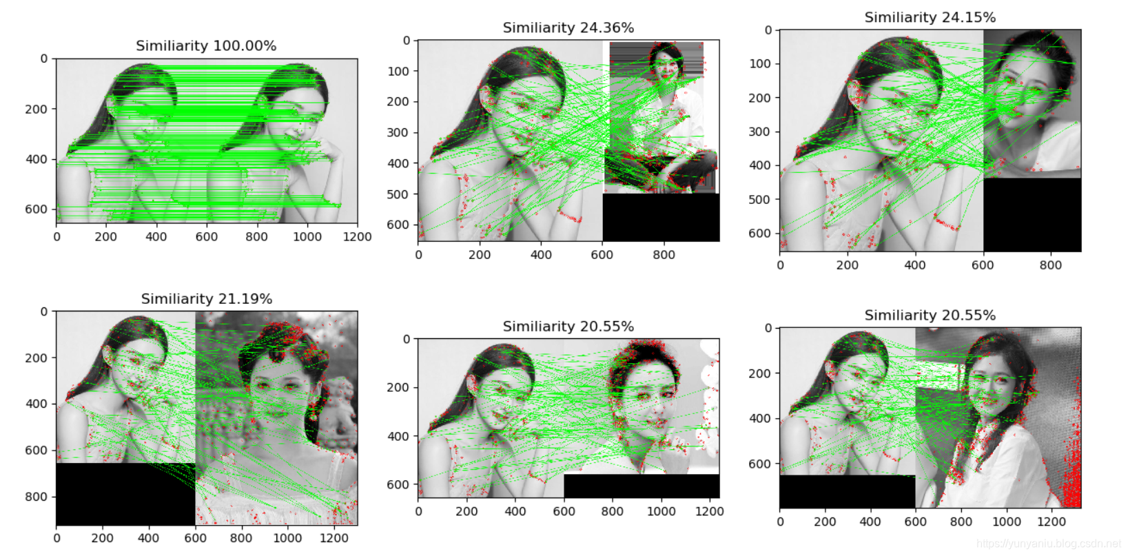 1. sift = cv2.xfeatures2d.SIFT_create() 2. # 查找监测点和匹配符 3. kp1, des1 = sift.detectAndCompute(img1, None) 4. kp2, des2 = sift.detectAndCompute(img2, None) 5. print(len(kp1), len(des1) ) # 1402, 1402 6. 7. 8. FLANN_INDEX_KDTREE = 0 9. indexParams = dict(algorithm=FLANN_INDEX_KDTREE, trees=5) 10. searchParams = dict(checks=50) 11. flann = cv2.FlannBasedMatcher(indexParams, searchParams) 12. # 进行匹配 13. matches = flann.knnMatch(des1, des2, k=2) 14. # 准备空的掩膜 画好的匹配项 15. matchesMask = [[0, 0] for i in range(len(matches))] 16. 17. for i, (m, n) in enumerate(matches): 18. if m.distance < 0.7*n.distance: 19. matchesMask[i] = [1, 0] 20. 21. drawPrams = dict(matchColor=(0, 255, 0), 22. singlePointColor=(255, 0, 0), 23. matchesMask=matchesMask, 24. flags=0) 25. img3 = cv2.drawMatchesKnn(img1, kp1, img2, kp2, matches, None, **drawPrams) 26. img_PutText = cv2.putText(img3, "SIFT+kNNMatch: Image Similarity Comparisonn", (40, 40),cv2.FONT_HERSHEY_COMPLEX, 1.5, (0, 0, 255), 3,) 27. img4 = cv2.resize(img_PutText, (0, 0), fx=0.5, fy=0.5, interpolation=cv2.INTER_NEAREST) #缩小1/2 28. 29. cv2.imshow("matches", img4) 30. cv2.waitKey(7000) 31. cv2.destroyAllWindows()