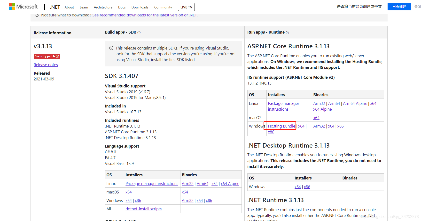安装 .NET Core 托管捆绑包