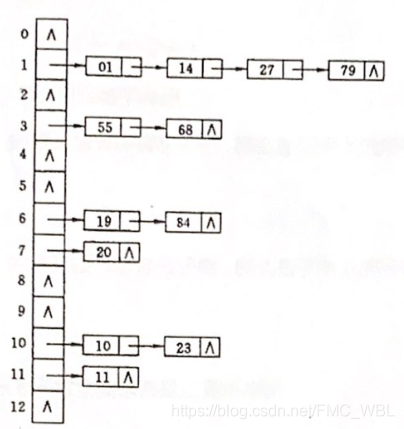 初值均应为空指针。在拉链法中,装填因子α可以大于1 ,但一般均取α ≤ 1。如图:链地址法处理冲突时的哈希表(同一链表中关键字自小至大有序)