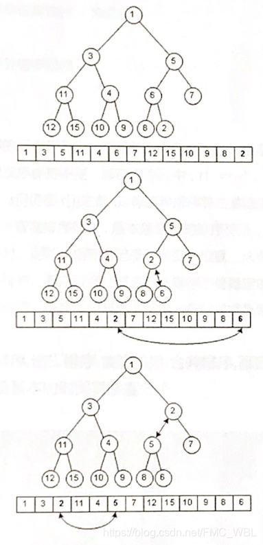 删除:堆中每次都只能删除第1个数据。为了便于重建堆,实际的操作是将最后一个数据的值赋给根结点然后再从根结点开始进行一次从上向下的调整。调整时先在左右儿子结点中找最小的, 如果父结点比这个最小的子结点还小说明不需要调整了,反之将父结点和它交换后再考虑后面的结点。相当于从根结点将一个数据的“下沉”过程。