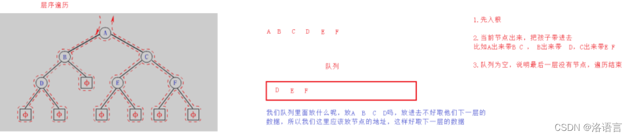 void LevelOrder(BTNode* root) { //创建队列q Queue q; //初始化队列 QueueInit(&q); //如果根结点不为空,将根节点入队列 if (root) QueuePush(&q, root); //进行循环,直到队列为空 while (!QueueEmpty(&q)) { //获取队列的第一个数据,并打印 QDataType front = QueueFront(&q); printf("%c ", front->data); //对头数据出队列 QueuePop(&q); //如果左子树不为空,左子树入队列 if (front->left != NULL) { QueuePush(&q, front->left); } //如果右子树不为空,右子树入队列 if (front->right != NULL) { QueuePush(&q, front->right); } } }