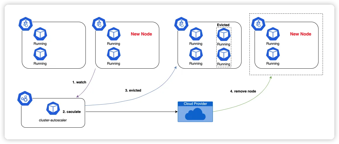 - 当 cluster-autoscaler 监听到 Node 的利用率低于设置的阈值时(