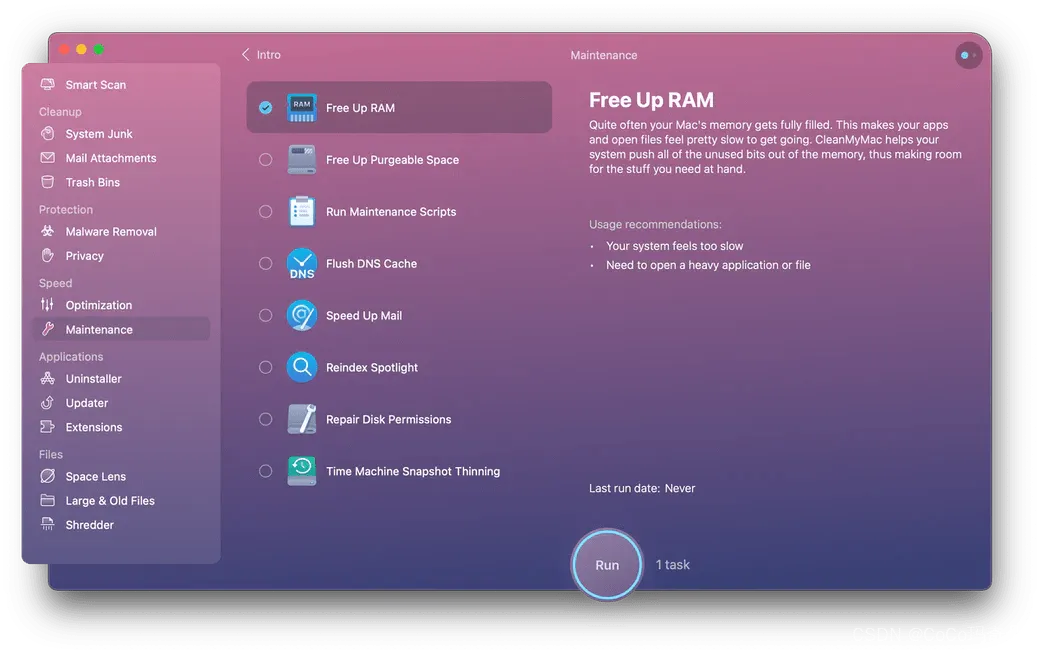 当你的Mac停止运行时,只需点击一下就可以释放它的内存。此外,运行维护脚本,使您的应用程序响应更快。现在,你的MacBook势不可挡。