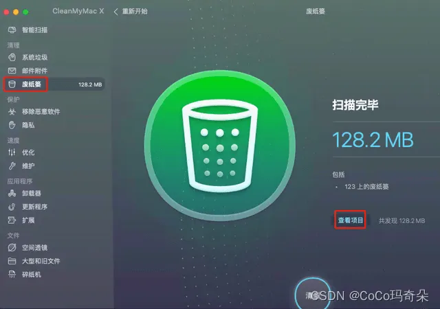 扫描完后,它会定位所有的废纸篓文件夹,点击“查看项目”,CleanMyMac将会通过一个列表呈现所有可以清理的垃圾。