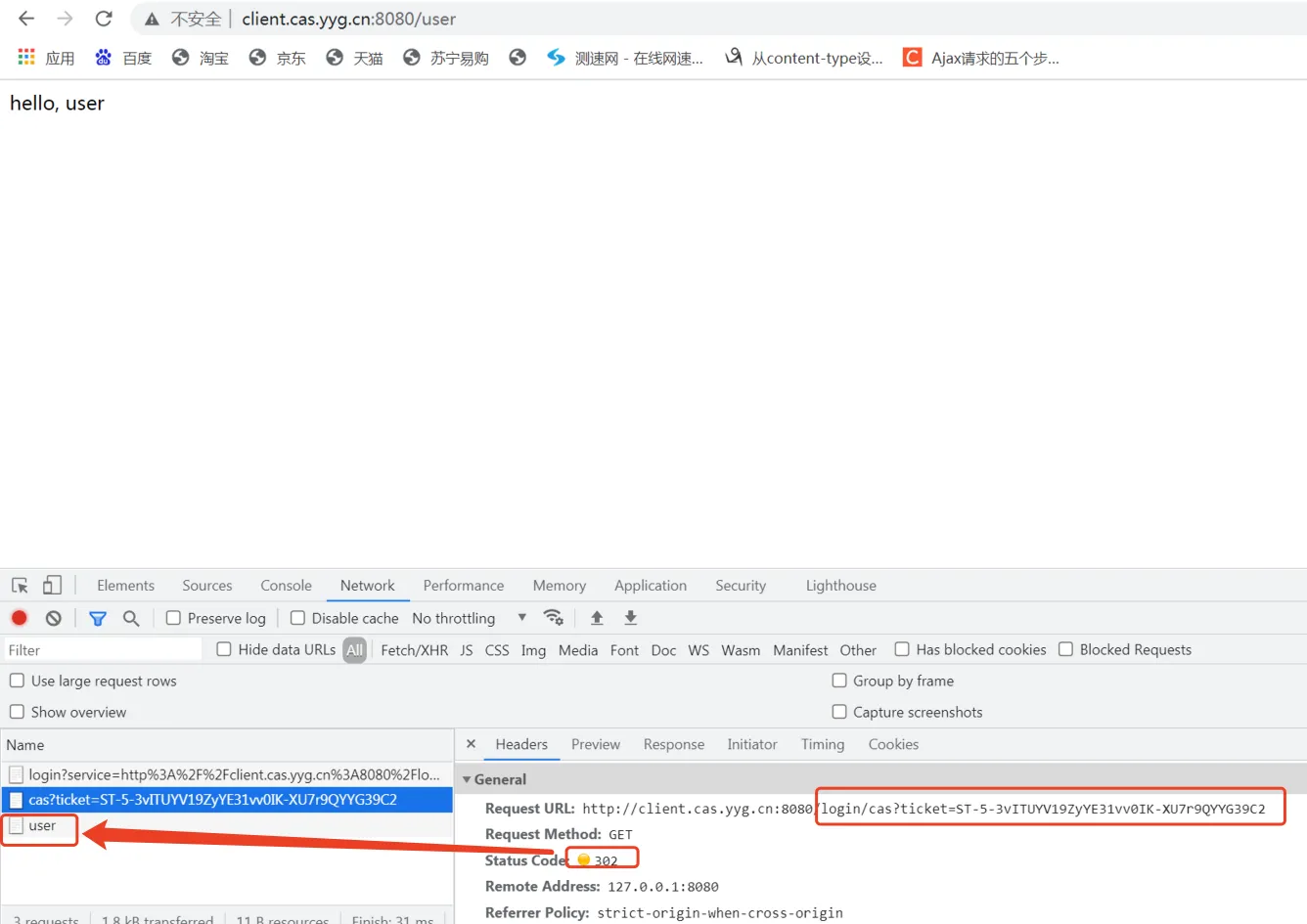 当我们输入正确的用户名和密码,CAS Server认证成功后,就会重新从CAS Server端重定向回到CAS Client端,从而实现对/user接口的访问。