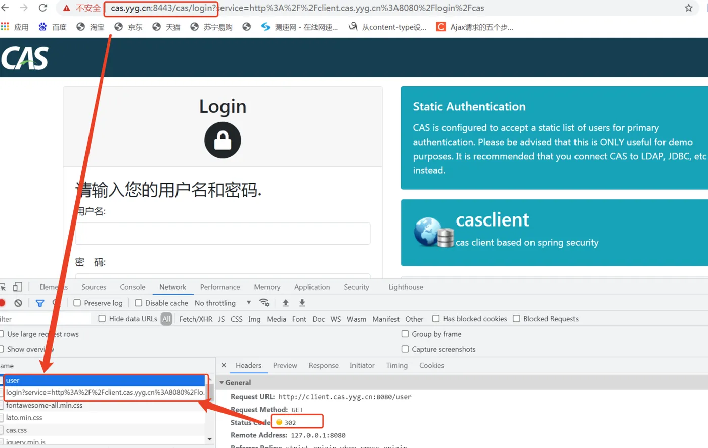 在我们输入http://client.cas.yyg.cn:8080/user地址后,在浏览器控制台,我们可以发现访问该接口时产生了一个302重定向,会从/user接口重定向到了CAS Server的/cas/login登录界面,这里需要我们输入之前在CAS Server的application.properties配置文件中配置的用户名和密码,yyg:123