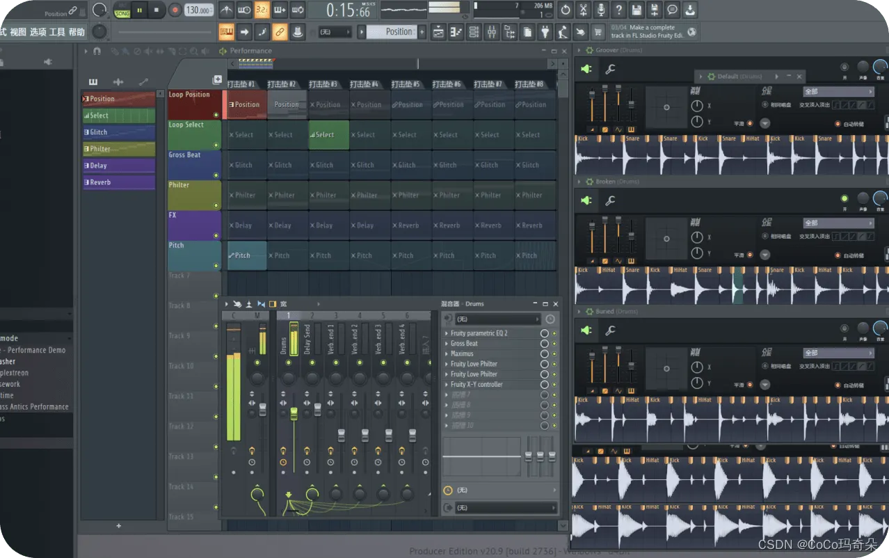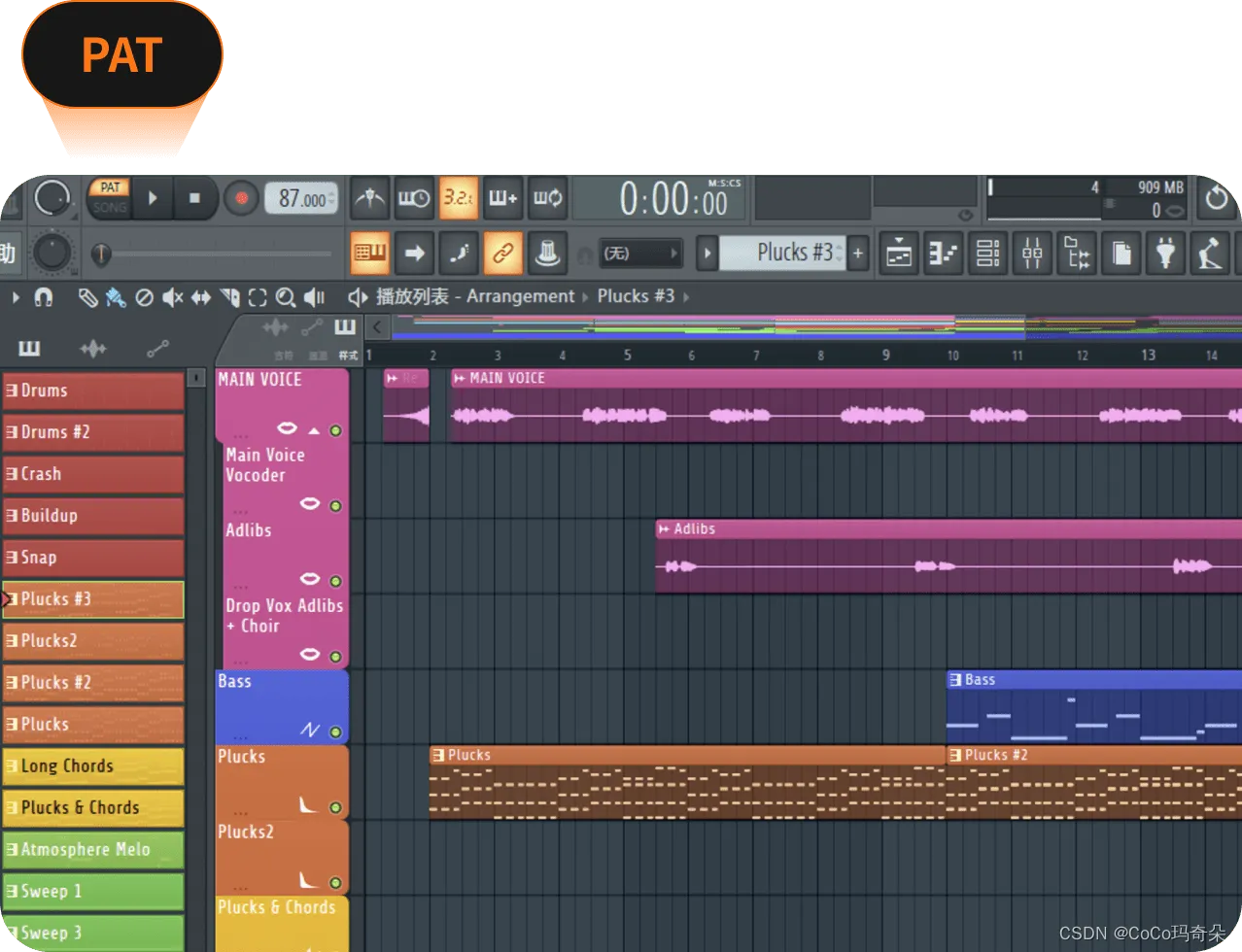 Pattern / Song双模式是FL的标志性特色,通过pattern写一个很短的部分,然后像搭积木一样叠加并排列到Song总轨,即可制作完整的音乐。对Hip-hop、EDM这种需要大量使用LOOP的风格来说,堪称神器!