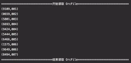 val conf = (new SparkConf).setAppName("TestReadRcFile").setMaster("local[1]") val spark = SparkSession .builder .config(conf) .getOrCreate() println(repeatString("=", 30) + "开始读取 OrcFile" + repeatString("=", 30)) import spark.implicits._ val orcInput = “” val orcFileRdd = spark.read.orc(orcInput).map(row => { val key = row.getString(0) val value = row.getString(1) (key, value) }).rdd println(repeatString("=", 30) + "结束读取 OrcFile" + repeatString("=", 30))