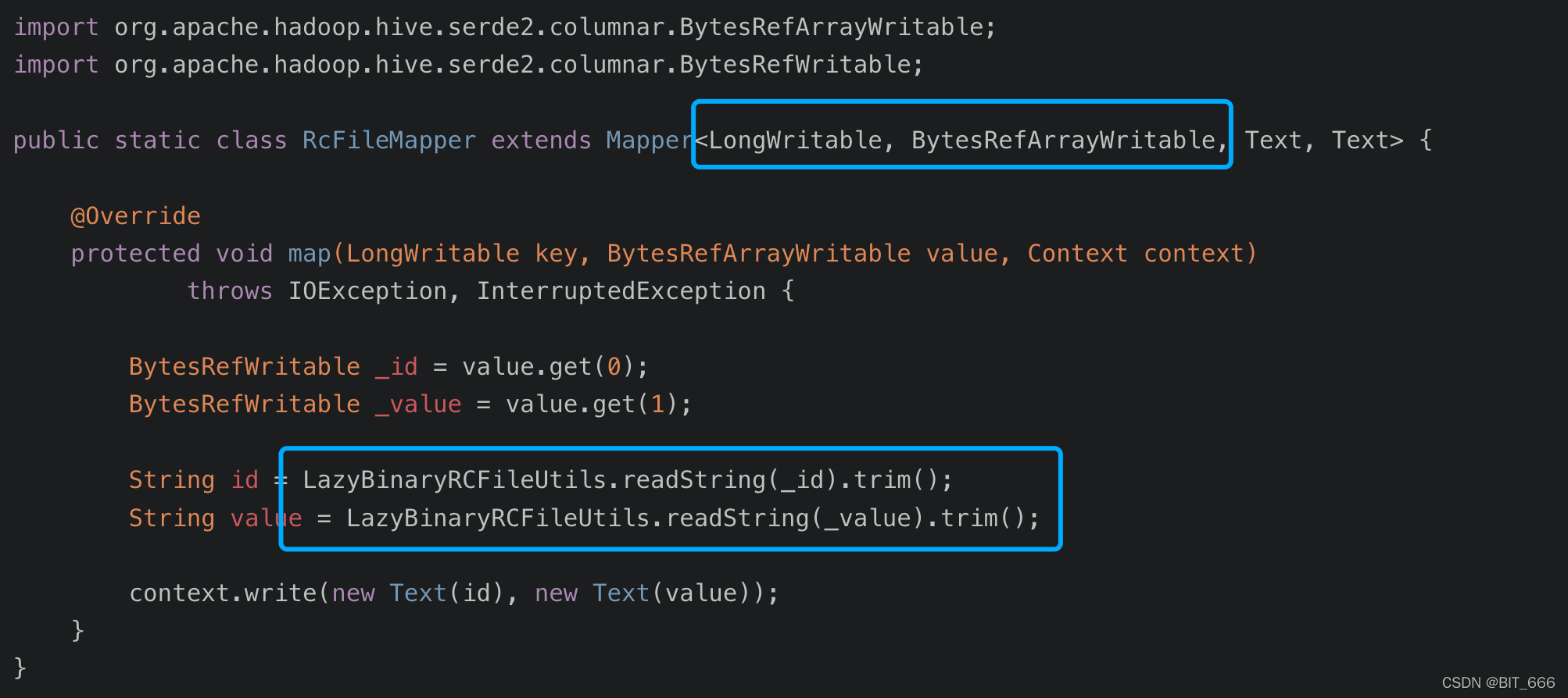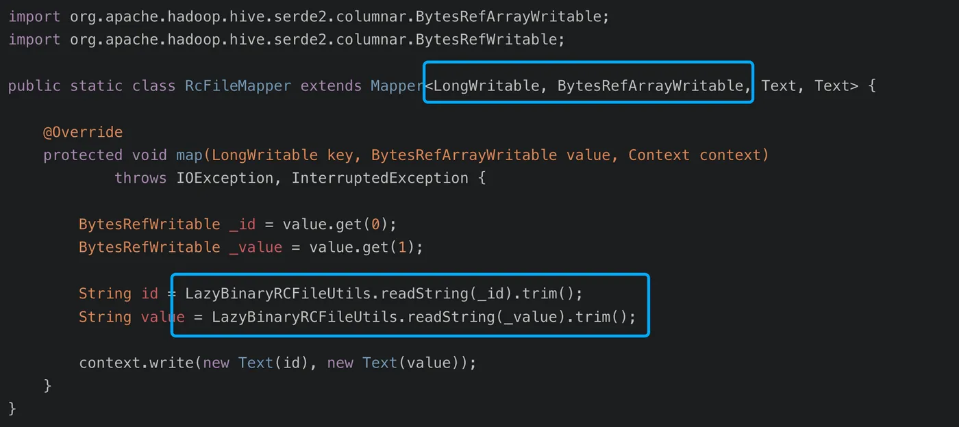keyClass 和 ValueClass 上面已经确定,inputFormat 也好确定,根据 MR - MultipleInputs.addInputPath 可以得知其 inputFormatClass 为 RCFileInputFormat,下面开始读取: