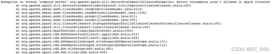 使用 rdd.filter 方法过滤 id 时使用了 return 方法,导致上述报错: