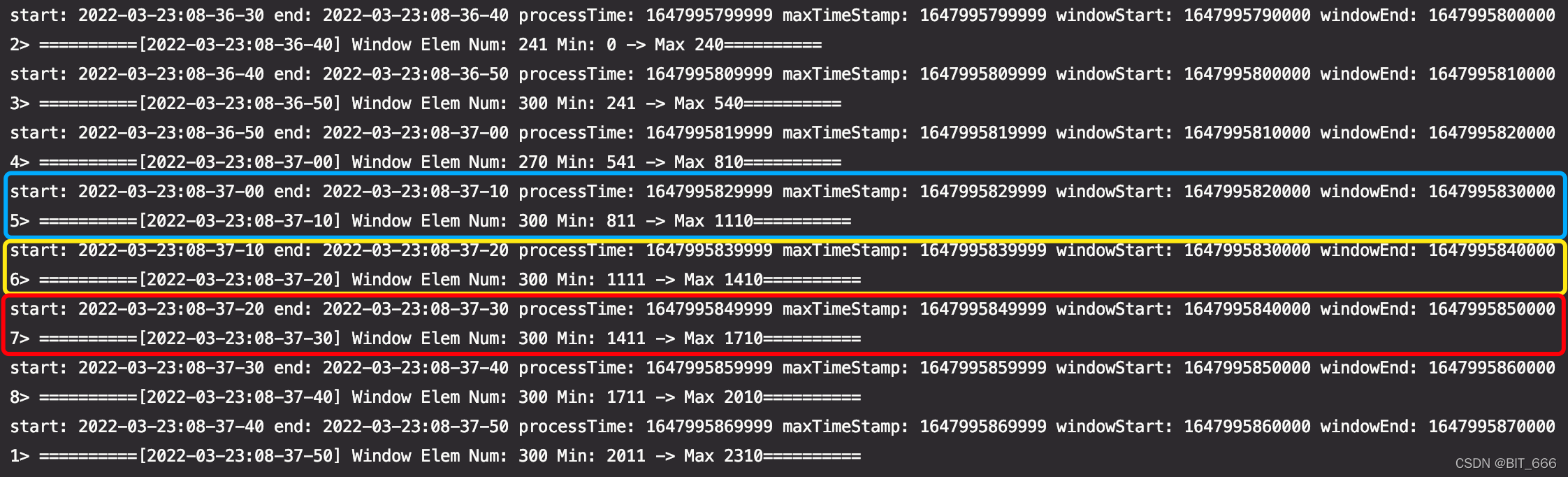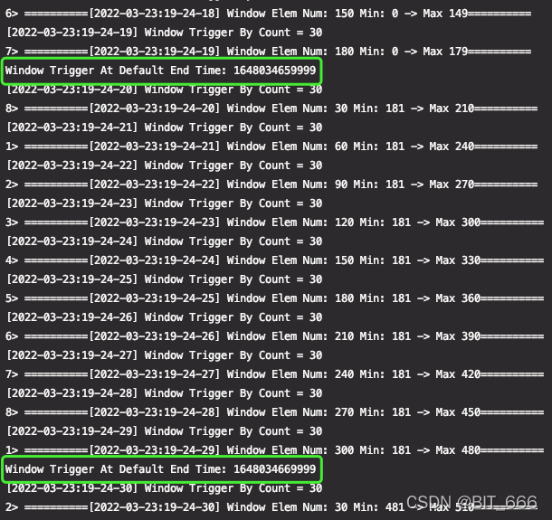 窗口每个10s执行一次触发,触发 elem 数量为 10x30 = 300,通过示例可以看到 window-start window-end 和其对应的 format 时间形式,以及再次验证 maxTimestamp = window.end - 1。