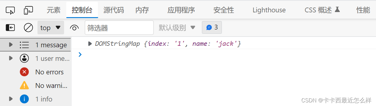 首先我们输出一下 dataset,看看 dataset 是什么,可以看到直接输出dataset,输出结果为一个对象 集合,所以dataset 是一个包含了所有 data- 开头的自定义属性的集合