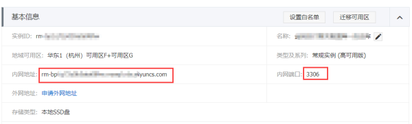 一般项目配置数据库连接时,都是配置数据库访问IP地址、数据库名称、访问端口、访问账号和密码等信息,这些在阿里云的云数据库上都是有的,以MySQL数据库为例说明: 你在阿里云的MySQL管理控制台,进入这个MySQL的管理界面,可以在那里看到这个MySQL数据库的IP连接地址和端口号,如下图: