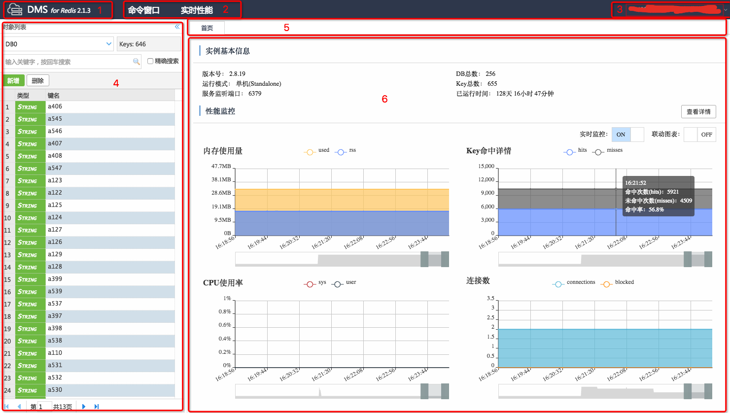 您提到的图示虽然不可见,但根据您的描述,这是对阿里云数据管理服务(Data Management Service, DMS)中Redis控制台界面各功能区域的一个概括。基于您的描述,我将为您详细解释每个区域的功能: