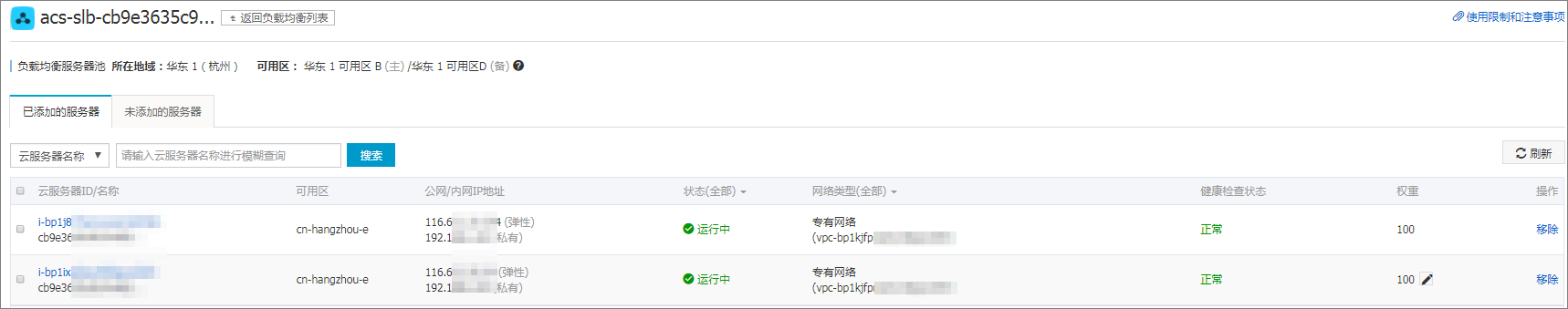 确认并保存:设置好权重后,点击“确定”完成添加。新添加的ECS实例会显示在“已添加的服务器”页签下,之后您可以根据需要移除实例或调整它们的权重。