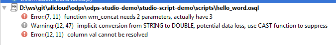 实时错误检查与提示:如您所见,当脚本中存在语法错误、列名错误或类型不匹配等潜在问题时,MaxCompute Studio能够即时高亮显示这些问题,并提供详细的错误或警告信息。这有助于开发者在提交作业前快速定位并修正问题,避免了因错误执行而导致的时间和资源浪费。