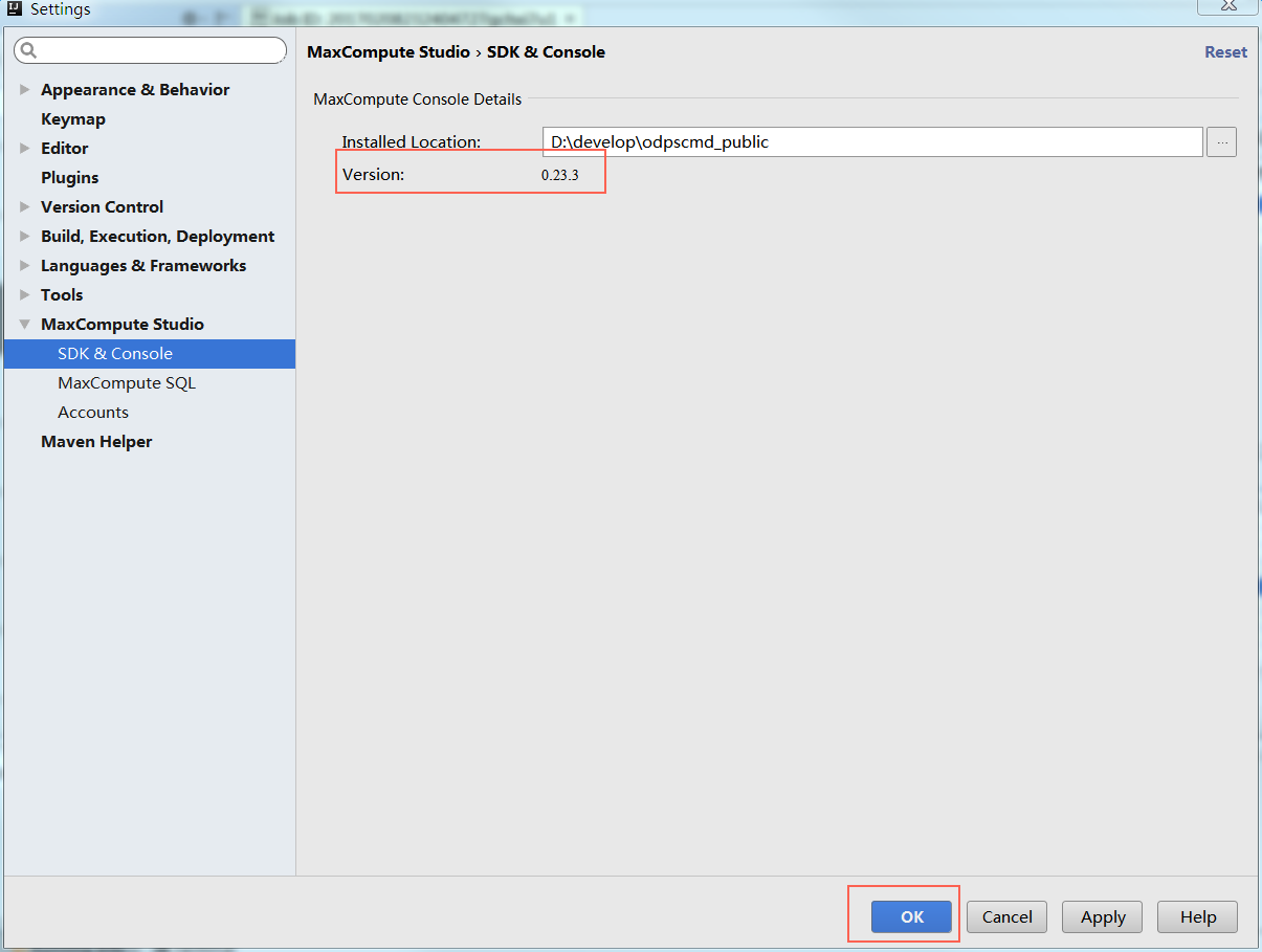 按钮保存设置。之后,MaxCompute Studio将会使用您指定的客户端版本来进行操作和编译。