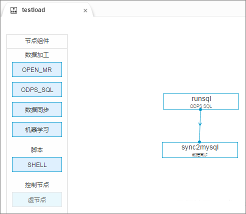 创建一个工作流,工作流里创建一个 SQL 节点和一个数据同步节点,并将两个节点连线配置成依赖关系,SQL 节点作为数据产出的节点,数据同步节点作为数据导出节点。