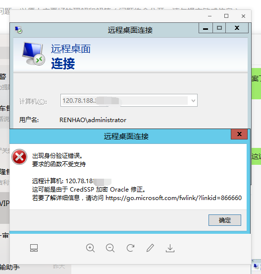 您好,微软官方 2018 年 5 月更新了凭据安全支持提供程序协议(CredSSP)相关补丁和身份验证请求方式。麻烦您登录阿里云控制台,通过控制台的远程连接功能连接到该服务器,然后按照参考文档的方法一下载并安装补丁到您的服务器,详情参考官方帮助文档:如何解决 Windows 实例出现身份验证错误及更正 CredSSP。
