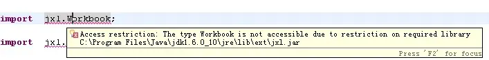 JExcelAPI 环境配置问题 下载了 JExcelAPI 将jxl.jar 复制到 jre\lib\ext目录了 但是却显示权限提示 之前Eclipse使用都长长 请教各位应该怎么配置?问题出在那里? 谢谢了