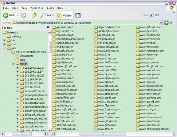 同时,在 MyHeritrix 工程目录下自动生成“jobs”文件夹,包含本次抓取任务。抓取下来网页以镜像方式存放,也就是将 URL 地址按“/”进行切分,进而按切分出来的层次存储。如图 17 所示。