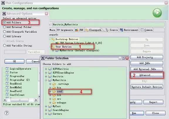 然后在 Classpath 页选择 UserEntries 选项,此时右边的 Advanced 按钮处于激活状态,点击它,在弹出的对话框中选择“Add Folders”,然后选择 MyHeritrix 工程下的 conf 文件夹。如图 7 所示。