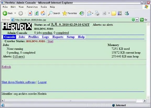 输入之前设置的用户名 / 密码:admin/admin,进入到 Heritrix 的管理界面,如图 10 所示。因为我们还没有创建抓取任务,所以 Jobs 显示为 0。