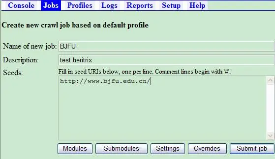 Heritrix 使用 Web 用户界面来启动、设置爬行参数并监控爬行,简单直观,易于管理。下面我们以北京林业大学首页 (http://www.bjfu.edu.cn/) 为种子站点来创建一个抓取实例。