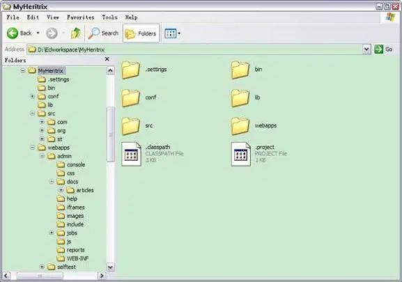1)将 heritrix-1.14.4-src\src\java 下的 com、org 和 st 三个文件夹拷贝进 MyHeritrix 工程的 src 下。这三个文件夹包含了运行 Heritrix 所必须的核心源代码;