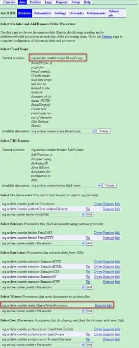 首先点击“Modules”按钮,在相应的页面为此次任务设置各个处理模块,一共有七项可配置的内容,这里我们只设置 Crawl Scope 和 Writers 两项,下面简要介绍各项的意义。