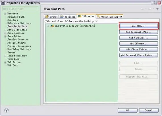 2)在 MyHeritrix 工程上右键单击选择“Build Path -> Configure Build Path …”,然后选择 Library 选项卡,单击“Add JARs …”,如图 1 所示。