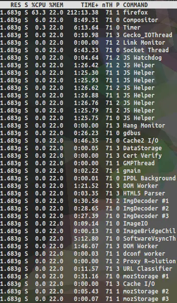 如果你把top命令从Tasks任务进程模式切换到Threads线程模式,则任一线程的%CPU都不能超过100%,比如: top -H -p pidof firefox