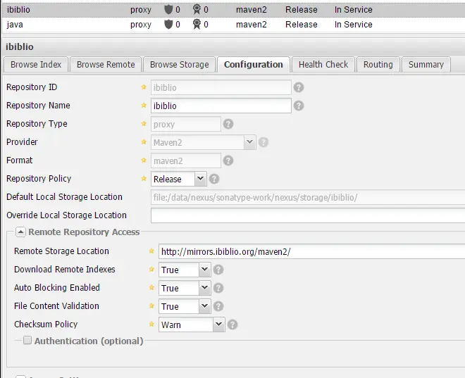 Override Local Storage Location一项,填写服务器上仓库文件存放地址,如file:/home/maven/LocalRepository/ibiblio/maven2。######试了下报socket连接错误,我在服务器上用curl是可以访问http://mirrors.ibiblio.org/maven2/的, Cannot fetch remote index for repository "ibiblio" [id=ibiblio] due to IO problem. java.net.SocketTimeoutException: Read timed out######谢谢,我试试,但是能问下为什么吗,不是已经有默认仓库地址了么 Default Local Storage Location: file:/data/nexus/sonatype-work/nexus/storage/ibiblio/,而且这个目录存在,且具备权限