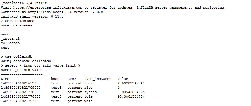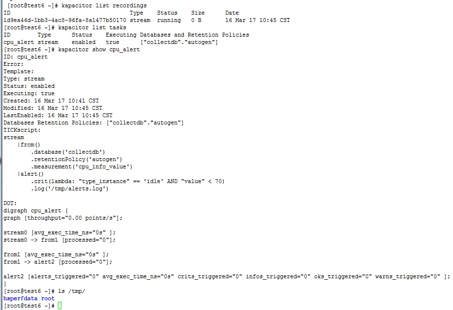 tick脚本内容为: [root@test6 ~]# cat cpu_alert.tick stream |from() .database('collectdb') .retentionPolicy('autogen') .measurement('cpu_info_value') |alert() .crit(lambda: "type_instance" == 'idle' AND "value" < 70) .log('/tmp/alerts.log') 启动kapacitor [root@test6 ~]# kapacitord '##:::'##::::'###::::'########:::::'###:::::'######::'####:'########::'#######::'########:: ##::'##::::'## ##::: ##.... ##:::'## ##:::'##... ##:. ##::... ##..::'##.... ##: ##.... ##: ##:'##::::'##:. ##:: ##:::: ##::'##:. ##:: ##:::..::: ##::::: ##:::: ##:::: ##: ##:::: ##: #####::::'##:::. ##: ########::'##:::. ##: ##:::::::: ##::::: ##:::: ##:::: ##: ########:: ##. ##::: #########: ##.....::: #########: ##:::::::: ##::::: ##:::: ##:::: ##: ##.. ##::: ##:. ##:: ##.... ##: ##:::::::: ##.... ##: ##::: ##:: ##::::: ##:::: ##:::: ##: ##::. ##:: ##::. ##: ##:::: ##: ##:::::::: ##:::: ##:. ######::'####:::: ##::::. #######:: ##:::. ##: ..::::..::..:::::..::..:::::::::..:::::..:::......:::....:::::..::::::.......:::..:::::..:: 2017/03/16 10:38:09 Using configuration at: /etc/kapacitor/kapacitor.conf 当前tasks和recordings都没有 [root@test6 ~]# kapacitor list tasks ID Type Status Executing Databases and Retention Policies [root@test6 ~]# kapacitor list recordings ID Type Status Size Date 新增一个tasks [root@test6 ~]# kapacitor define cpu_alert -type stream -tick cpu_alert.tick -dbrp collectdb.autogen [root@test6 ~]# kapacitor list tasks ID Type Status Executing Databases and Retention Policies cpu_alert stream disabled false ["collectdb"."autogen"] 新增一个recording [root@test6 ~]# kapacitor record stream -task cpu_alert -duration 20s 启动task [root@test6 ~]# kapacitor enable cpu_alert CPU高负载测试