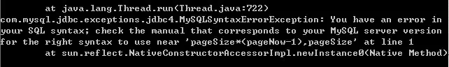 我的连接数据库的代码是:ps=ct.prepareStatement("select * from fk limit pageSize*(pageNow-1),pageSize"); 报错信息是: 谢谢师兄、师姐,大哥大姐,帮我看看这种错误信息是怎么回事?谢谢大家!!