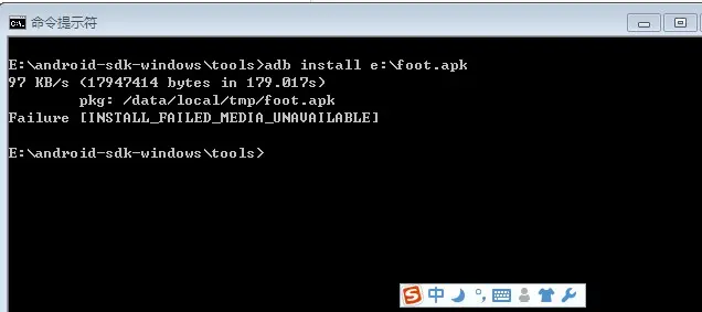 通过CMD命令窗口往Android虚拟机上面安装程序,总是报 Failure [INSTALL_FAILED_MEDIA_UNAVAILABLE]错误。请问要怎么解决??