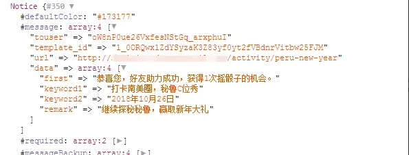 $url = 'http://minisite.dragontrail.com/activity/peru-new-year'; $templateId = '1_0ORQwx1ZdYSyzaK3Z83yf0yt2fVBdnrVitbw25FJM'; $first_text = '恭喜您,好友助力成功,获得1次摇骰子的机会。'; $keyword1 = '打卡南美圈,秘鲁C位秀'; $keyword2 = date("Y年m月d日",request()->input('time')); $remark_text = '继续探秘秘鲁,赢取新年大礼'; if($userinfo&&$userwechat){ try { $userOpenId = $userwechat['openid']; $data = array('first'=>$first_text,'keyword1'=>$keyword1,'keyword2'=>$keyword2,'remark'=>$remark_text); // dd( App::make(WeChat3rdService::class)->get3rdService($app_id)->notice->to($userOpenId)->uses($templateId)->andUrl($url)->data($data)); $messageId = App::make(WeChat3rdService::class)->get3rdService($app_id)->notice->to($userOpenId)->uses($templateId)->andUrl($url)->data($data)->send(); \Log::info("发送参与者模板消息:".$messageId); } catch (Exception $e) { $user_send_fail = 1; } 而且检查后看到在发送请求之前,数据都是完整的