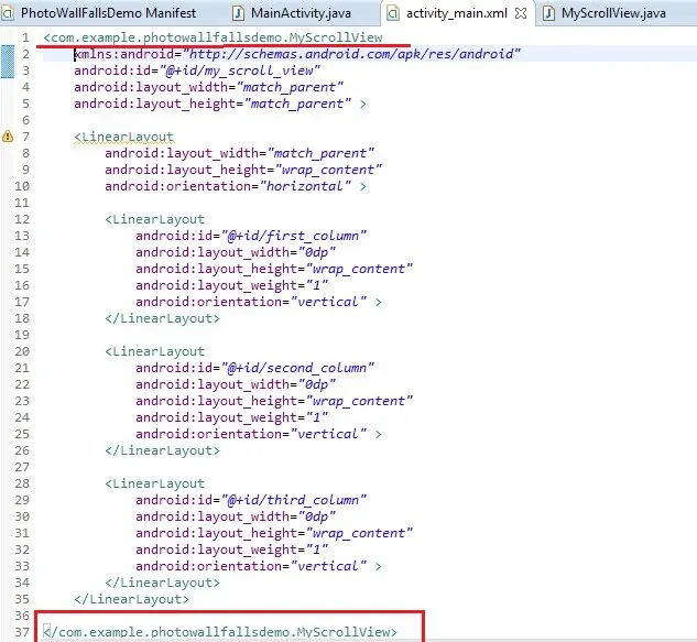 这是瀑布照片墙的功能,标红的地方,我先前没用过,标红的位置,我先前通常在5大布局中选用一个,一般是LinearLayout, relativelayoutl,像这样的写法,不是很理解,请求解释。