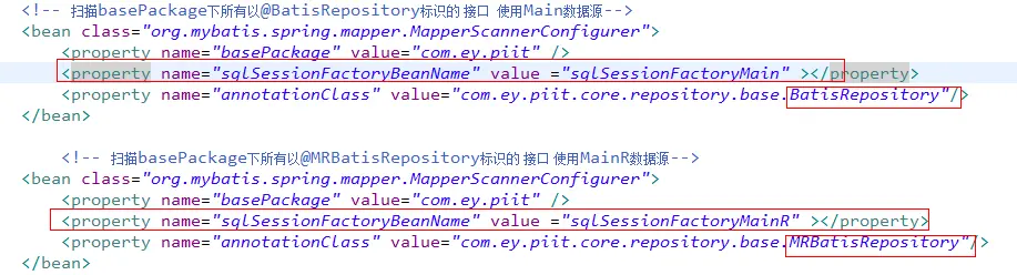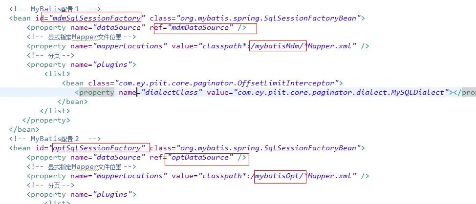 我们公司也是使用这样的配置,现在遇到一个问题,需要配置多个数据源dataSource,然后特定的几个Dao使用特定的数据源,我分别配置了几个数据源,然后在mybatis配置位置使用了不同的id,在mapperLocations 的value值指向不同的mapper.xml,但是不行,如图,第一个是原来的 第二个是我配置的,该如何配置