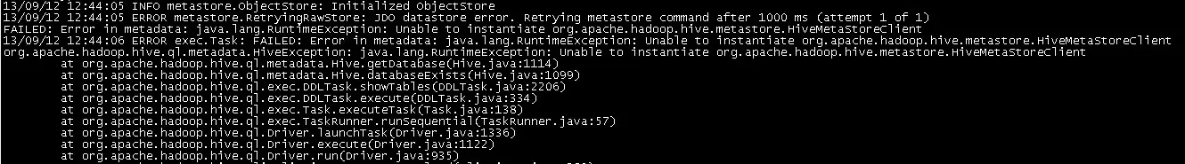 <property> <name>javax.jdo.option.ConnectionURL</name> <value>jdbc:mysql://localhost:3306/hive?createDatabaseIfNotExist=true</value> </property> <property> <name>javax.jdo.option.ConnectionDriverName</name> <value>com.mysql.jdbc.Driver</value> </property> <property> <name>javax.jdo.option.ConnectionUserName</name> <value>hive</value> </property> <property> <name>javax.jdo.option.ConnectionPassword</name> <value>123456</value> </property> <property> <name>hive.metastore.local</name> <value>true</value> </property>mysql的权限应该没问题,我在远端是用hive这个账户,用jdbc做了一个查询是正常的,然后在其他机器,本机用mysql -uhive -p的方式登录也是没问题的。 运行hive shell,执行show tables,显示如下错误: